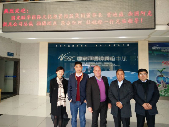 2017年3月21日,春意盎然,菜花初黄,法国阿克提尼公司总裁福德瑞克、国光昭华国家文化投资控股集团董事长董迪威一行到国家不锈钢质检中心参观考察,中心领导在会议详细介绍了国检中心的检验流程、设备能力、人才配备等,总裁福德瑞克对于中心的业务水平和服务质量给予了充分的肯定,感慨颇深:“不愧为国家一流实验室”。双方交谈融洽,外国客户表示将对相关业务进一步磋商。
